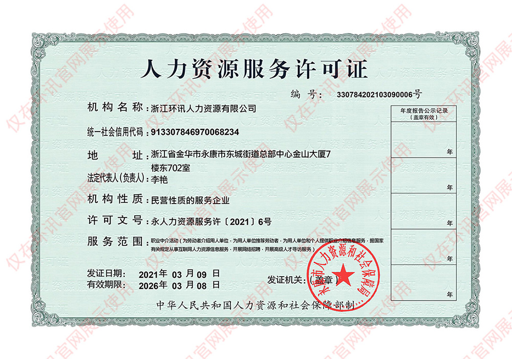 返回首頁 《企業營業執照》 《人力資源服務許可證》 《金華人力資源服務機構年度評價》 《永康優秀民營人才中介》 《愛心企業》